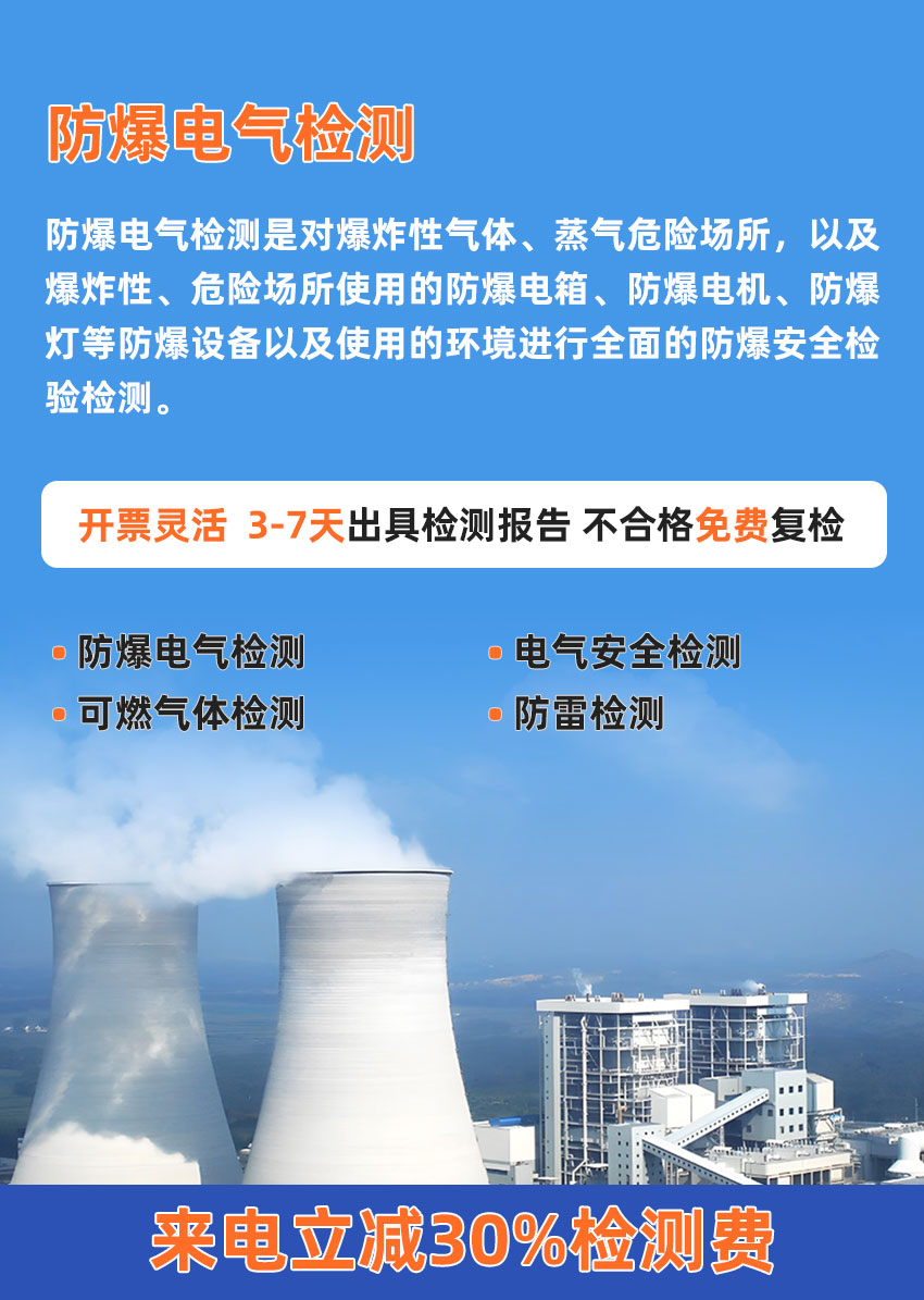 防爆电气安全检测是对爆炸性气体、蒸气危险场所,以及爆炸性、危险场所使用的防爆电箱、防爆电机、防爆灯等防爆设备以及使用的环境进行全面的防爆安全检验检测,依照国家AQ3009-2007《危险场所电气安全和防爆规范》、《电气装置安装工程 爆炸和火灾危险环境电气装置施工验收规范》等规范要求,来辨识查找环境或设备存在的防爆安全隐患,并提供专业的现场防爆安全解决方案。出具具有法律效力的检测报告。